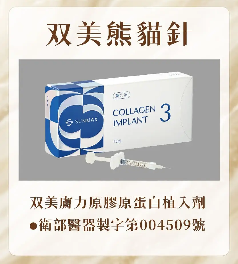 •「膚力原膠原蛋白植入劑」衛部醫器製字第004509號(俗稱熊貓針 )
