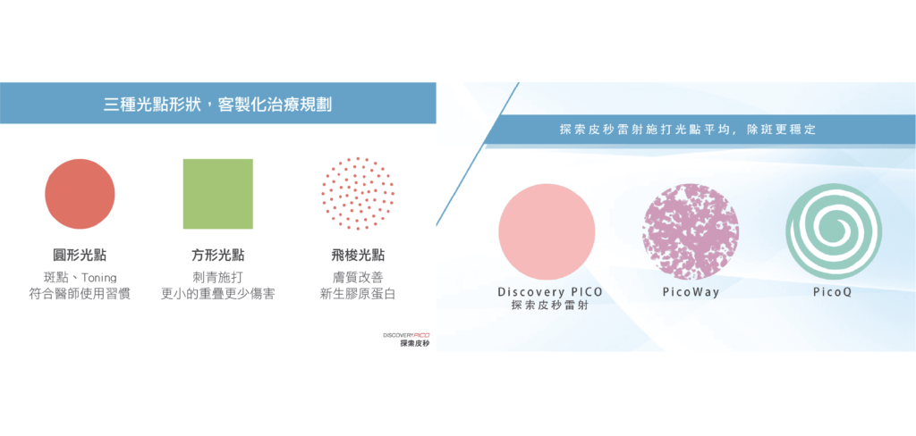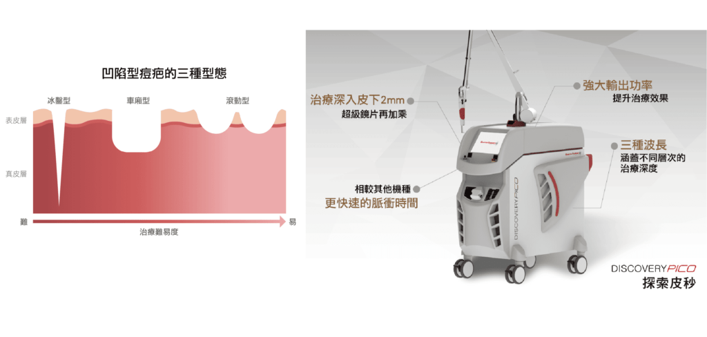 探索皮秒在改善毛孔粗大、痘疤和凹疤等肌膚問題上效果顯著。蜂巢皮秒(Picosure)以其獨特的光震波技術聞名,而探索皮秒(Discovery Pico)的ReFIX超級鏡片是市面上頂規的蜂巢透鏡此技術能刺激膠原蛋白增生修復凹洞與細紋,同時縮小毛孔和痘疤,針對肌膚凹凸不平提供精準的修復方案