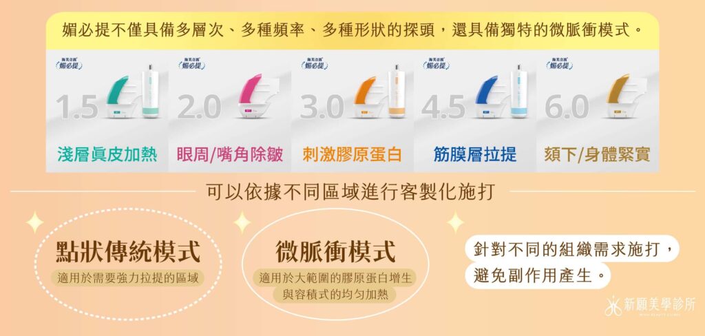媚必提不僅具備多層次、多種頻率、多種形狀的探頭,還具備獨特的微脈衝模式,可以依據不同區域進行客製化施打: