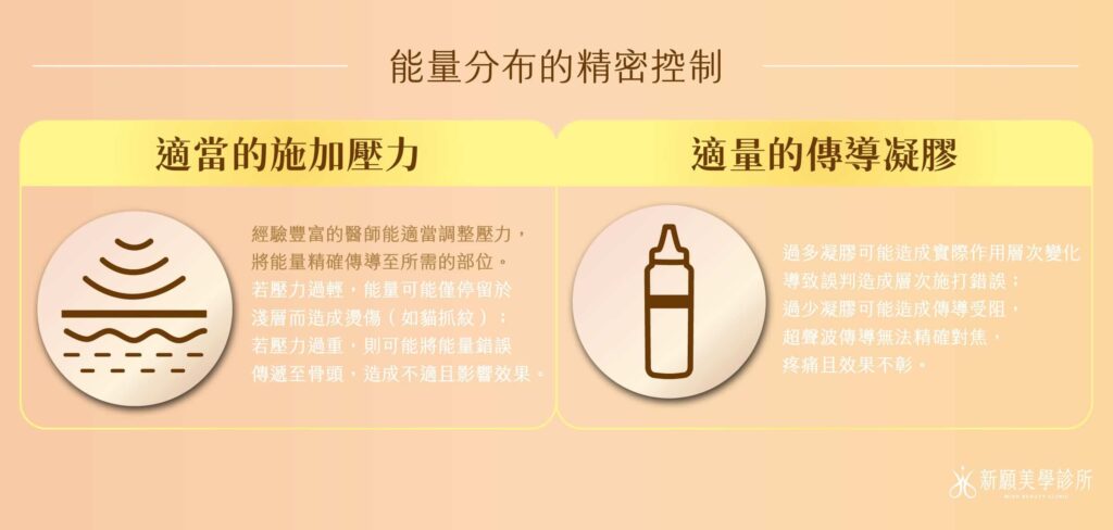探頭施加在皮膚上的壓力也相當重要。經驗豐富的醫師能適當調整壓力,將能量精確傳導至所需的部位。若壓力過輕,能量可能僅停留於淺層而造成燙傷(如貓抓紋);若壓力過重,則可能將能量錯誤傳遞至骨頭,造成不適且影響效果。