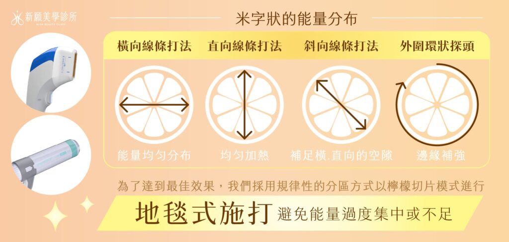 - 橫向線條打法:從左至右,或從右至左,橫跨施打區域,確保橫向能量均勻分布。