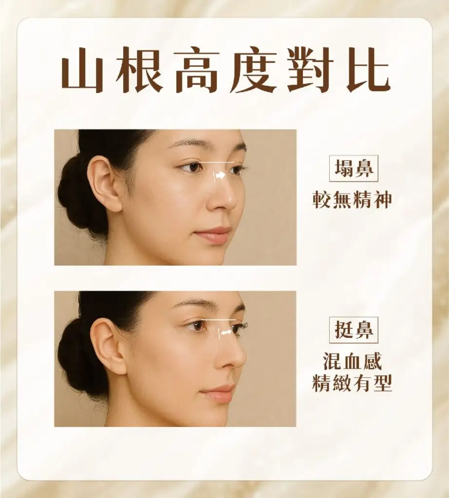 - 山根塌陷:讓五官看起來較為鬆散、輪廓不集中。透過在山根水平放線,可模擬鼻骨挺度,提升整體立體感,強化視覺聚焦。