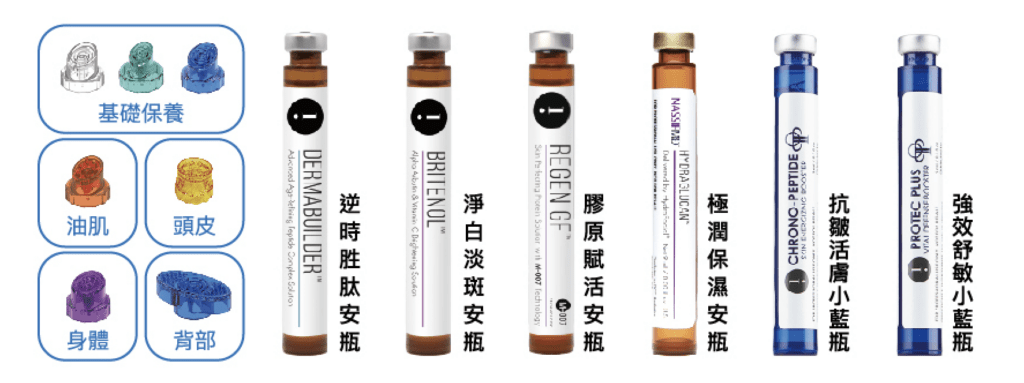 海菲秀Syndeo除了基本三步驟的護理外,還提供多款專業精華安瓶可進行療程升級,包括Britenol™ 美白安瓶、Regen GF™ 生長因子安瓶、DermaBuilder™ 胜肽安瓶、NASSIFMD 保濕安瓶、CIRCADIA® CHRONO® PEPTIDE 活膚小藍瓶、CIRCADIA® PROTEC PLUS 舒敏小藍瓶,以及HYDRAFACIAL Keravive™ 育髮組。