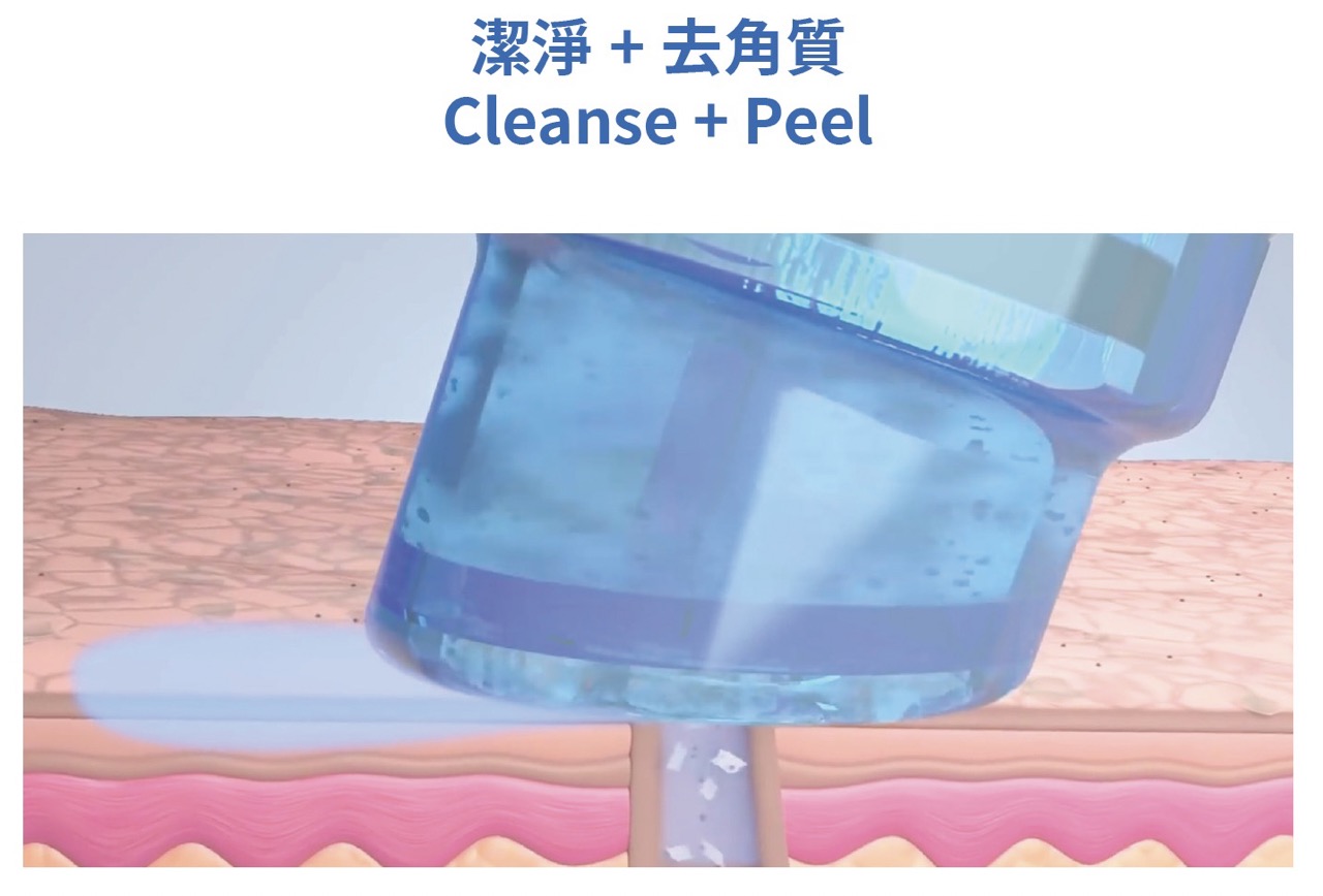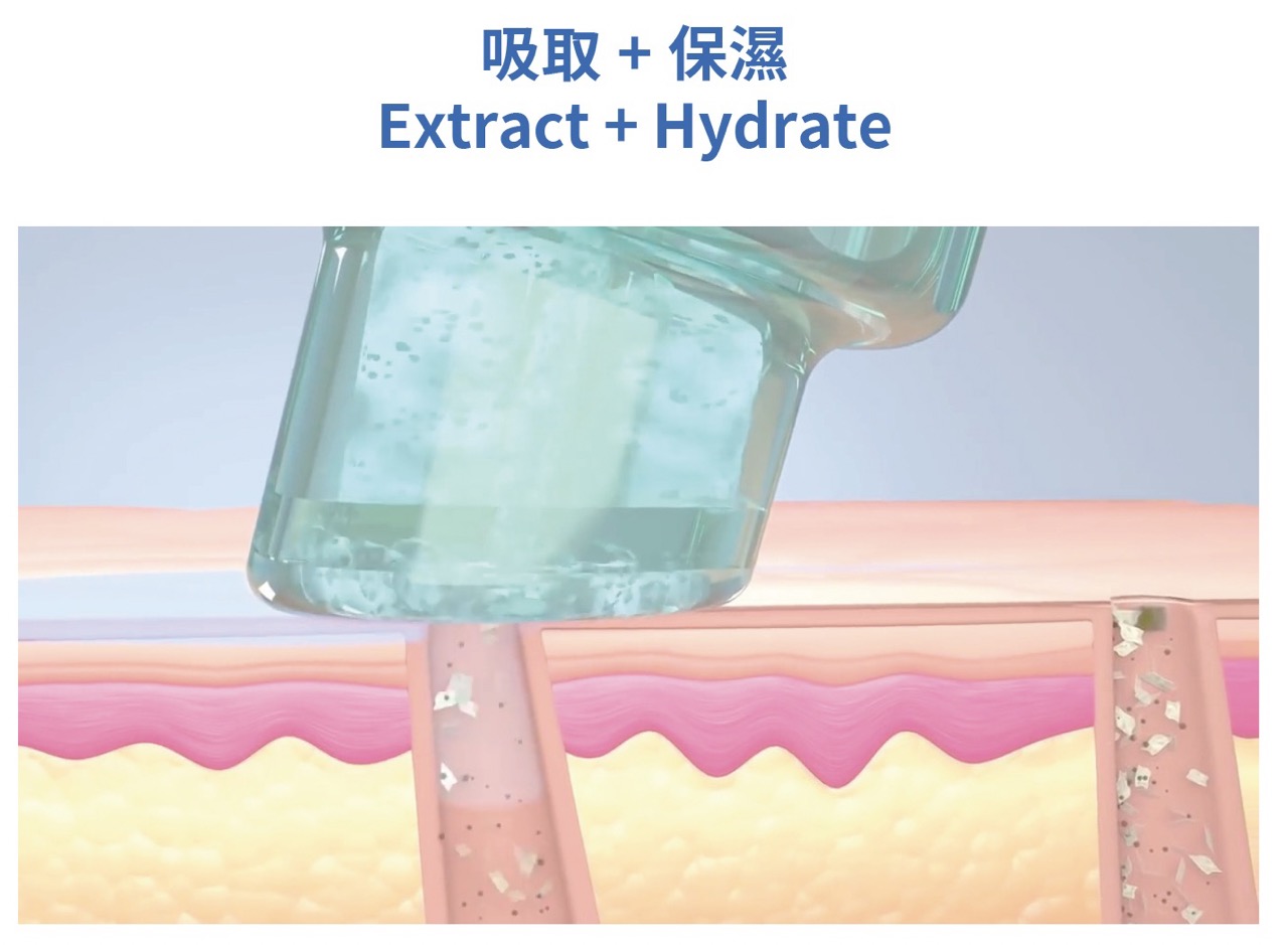 使用藍色端頭結合Activ-4™溶液,內含葡萄糖胺鹽酸鹽與乳酸成分,能溫和軟化肌膚表層的皮脂與污垢,同時將髒污吸出,並注入保濕精華提升鎖水能力,讓肌膚柔軟細緻。