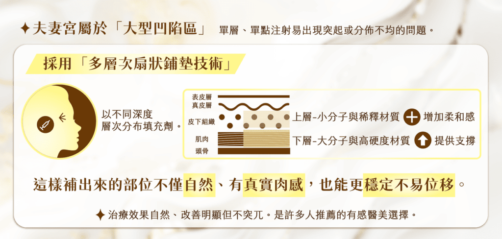 夫妻宮屬於「大型凹陷區」,單層、單點注射易出現突起或分佈不均的問題。因此我們會採用「多層次扇狀鋪墊技術」,以不同深度層次分布填充劑。上層使用小分子與稀釋材質增加柔和感,下層則以大分子與高硬度材質提供支撐。這樣補出來的部位不僅自然、有真實肉感,也能更穩定不易位移。