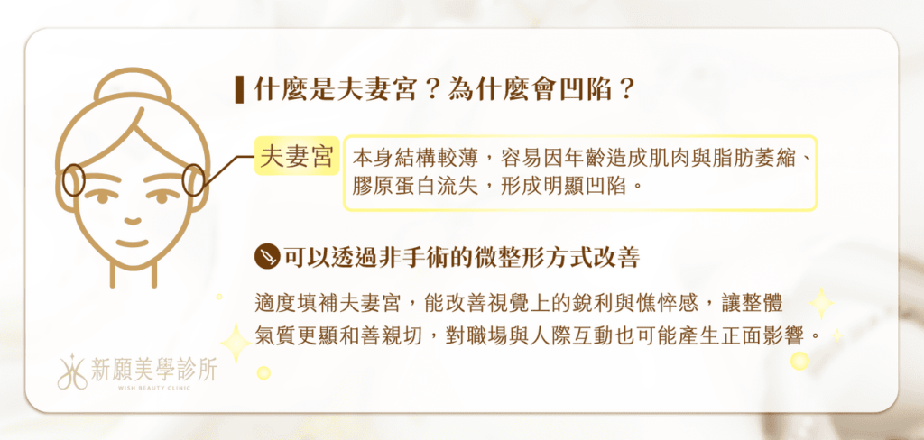 夫妻宮位在眉尾與顴骨之間的區域,當這個區塊天生骨架較凹、又隨年齡流失脂肪與軟組織時,會產生深凹陰影,加重臉部銳利感,容易被誤會為臉臭或疲憊。若能透過醫美技術補平這個部位,讓輪廓線條更柔和,整體氣質也會隨之提升。