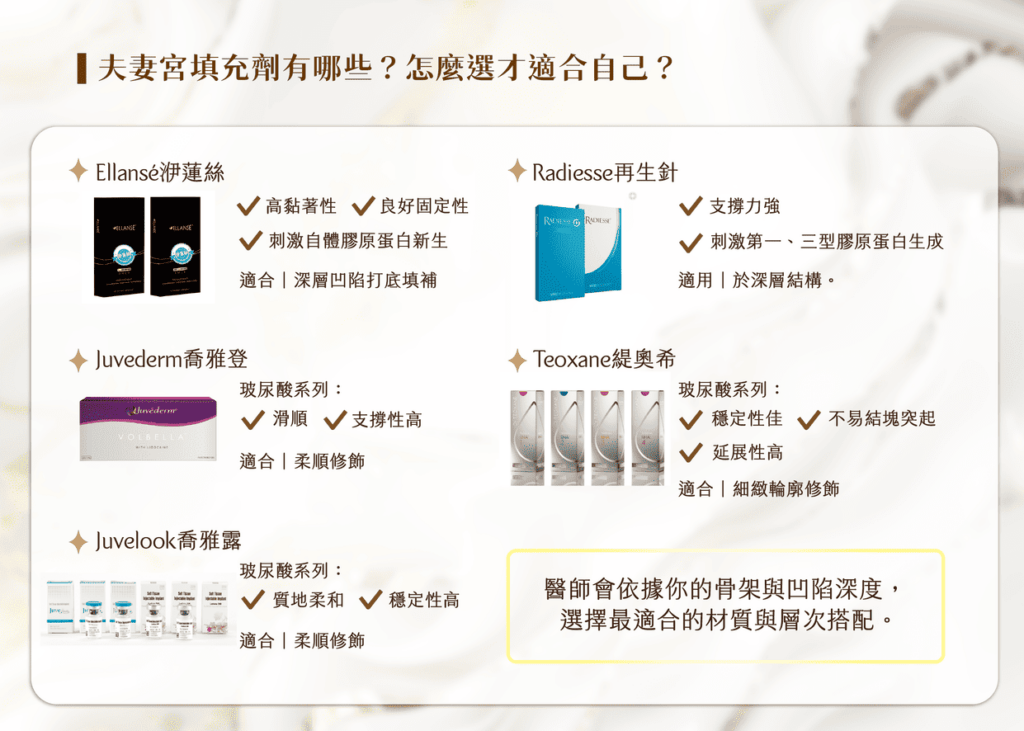 選擇適合的填充產品,是打造自然效果的關鍵。針對夫妻宮這類需要支撐力與穩定度的區域。